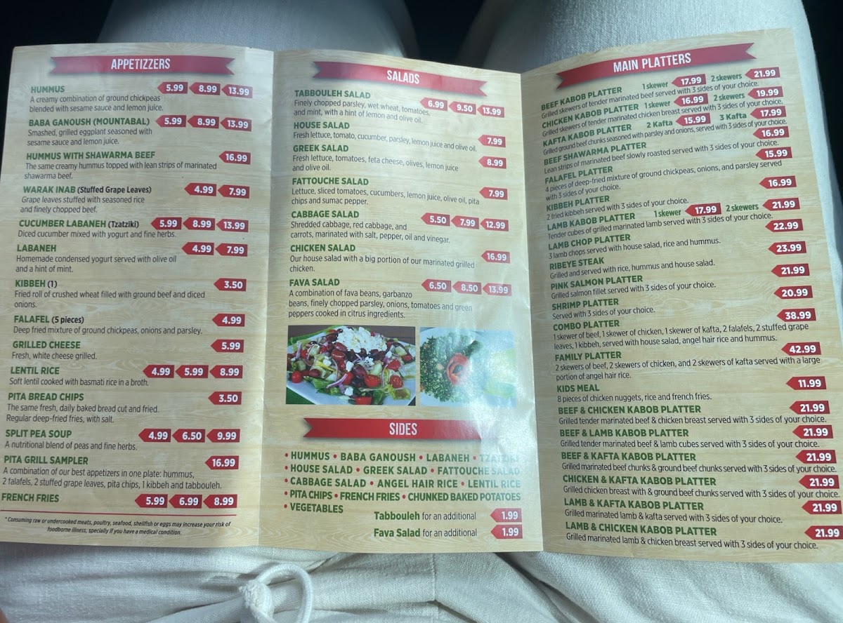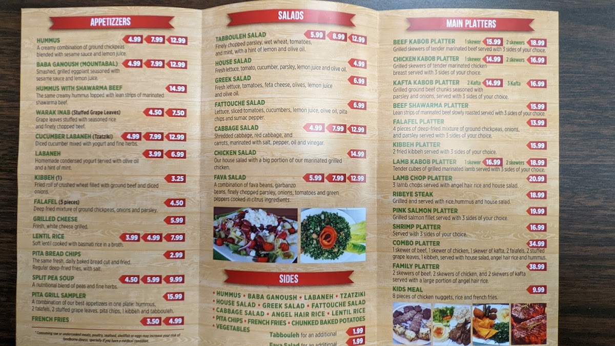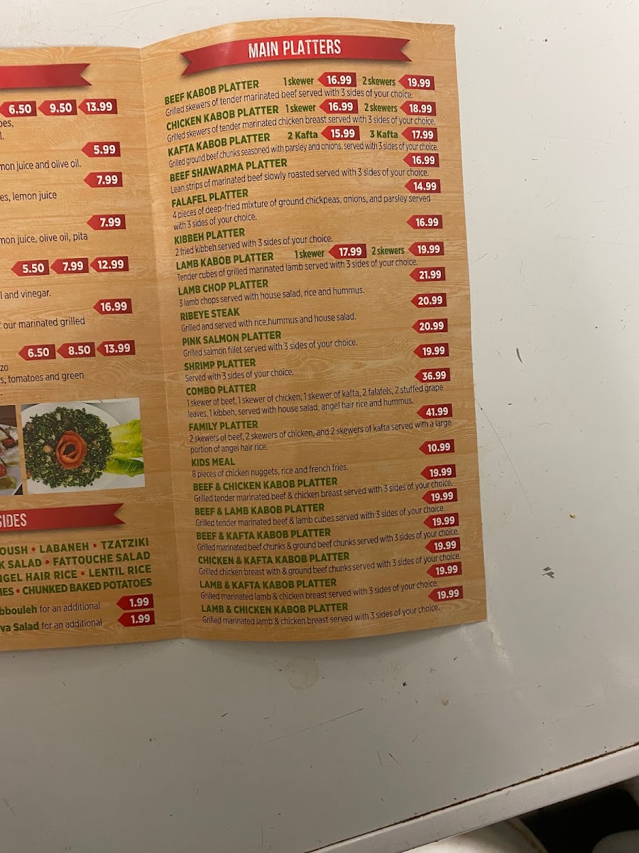 1 skewer of beef, 1 skewer of chicken, 1 skewer of kafta, 2 falafels, 2 grape leaves, 1 kibbeh, served with hummus, house salad and angel hair rice.