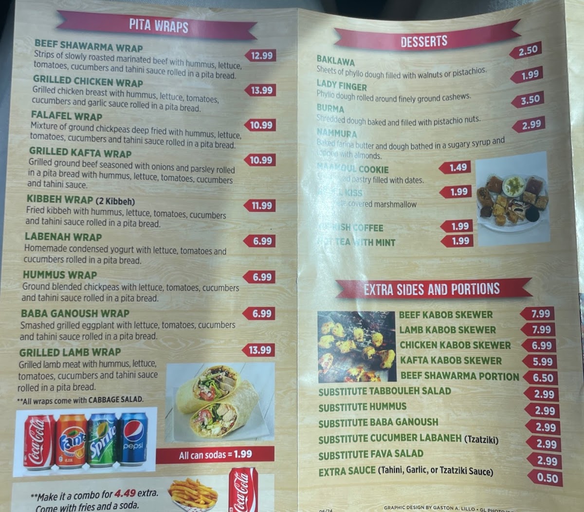 Two fried kibbeh, hummus, lettuce, tomatoes, cucumbers, cabbage salad and your choice of sauce rolled in a pita bread.
