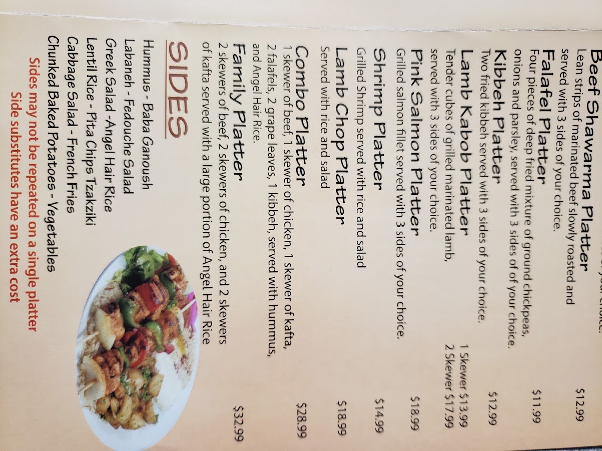 Grilled marinated lamb & ground beef chunks served with 3 sides of your choice.